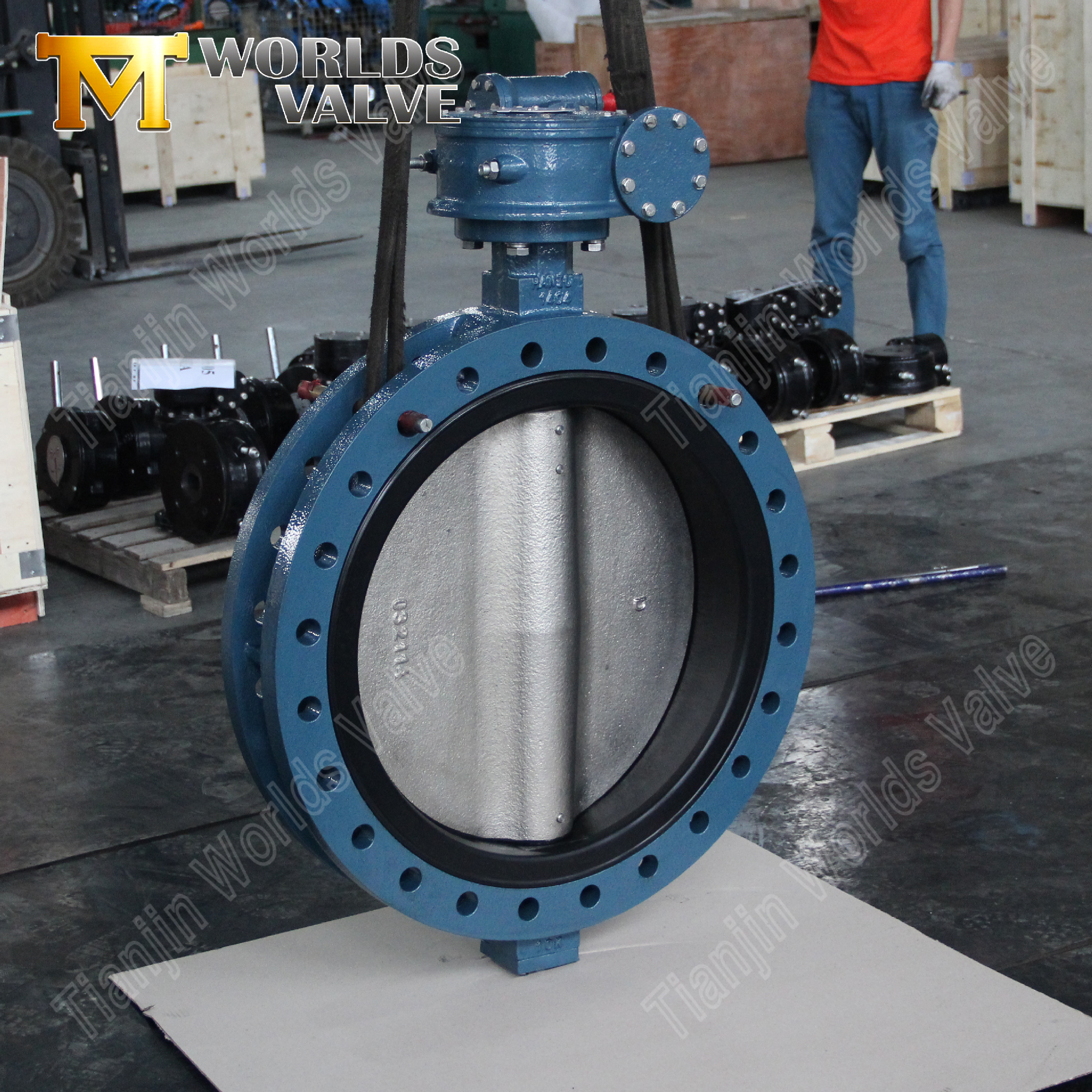 This article introduces the double-offset flanged butterfly valve from Tianjin Worlds Valve Co., Ltd. The valve features DN400 size, Class 150 pressure rating, ductile iron body and disc, flanged end connections, and an ISO 5211 top flange for direct actuator mounting. It highlights the double-offset design for reduced friction and improved sealing, while emphasizing that specific performance data depends on seat material, coating, and operating conditions. The company operates an ISO 9001 certified manufacturing system and offers test reports, material certificates, and applicable certifications upon request.